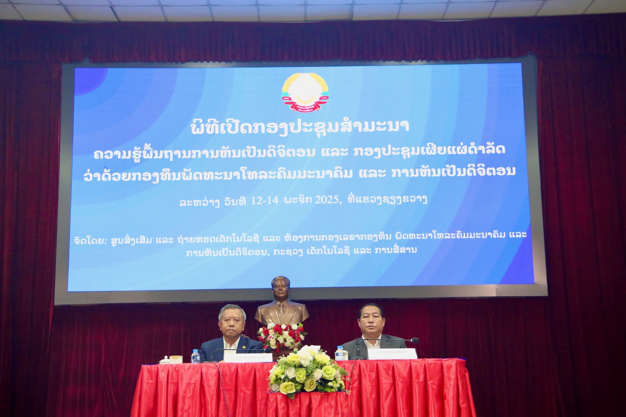 ວັນທີ 12-13 ພະຈິກ 2025 ພະແນກເຕັກໂນໂລຊີ ແລະ ການສື່ສານແຂວງຊຽງຂວາງໄດ້ຈັດກອງປະຊຸມສໍາມະນາຄວາມຮູ້ພື້ນຖານການຫັນເປັນດິຈິຕອນ ແລະ ກອງປະຊຸມເຜີຍແຜ່ດຳລັດວ່າດ້ວຍກອງທືນພັດທະນາໂທລະຄົມ ແລະ ການຫັນເປັນດິຈິຕອນ ໂດຍເປັນທານຮ່ວມຂອງ ທ່ານ ບັນດິດ ສຈ ບໍ່ວຽງຄຳ ວົງດາລາ ລັດຖະມົນຕີກະຊວງເຕັກໂນໂລຊີ ແລະ ການສື່ສານ ແລະ ທ່ານ ບຸນຈັນ ສີວົງພັນ ກຳມະການສູນກາງພັກ ເລຂາຄະນະບໍລິຫານງານພັກແຂວງ ເຈົ້າແຂວງຊຽງຂວາງ ແລະ ມີບັນດາຄະນະພັກ ແລະ ພະນັກງານວິຊາການຈາກ ພະແນກການ, ກົມກອງ, ເມືອງ, ຫ້ອງການ, ອົງການທຽບເທົ່າ, ໂຮງຮຽນ, ສະຖາບັນການສຶກສາ, ລັດວິສາຫະກິດຢູ່ແຂວງຊຽງຂວາງເຂົ້າຮ່ວມຈໍ່ານວນ 85 ຄົນ ຍິງ 24 ຄົນ.